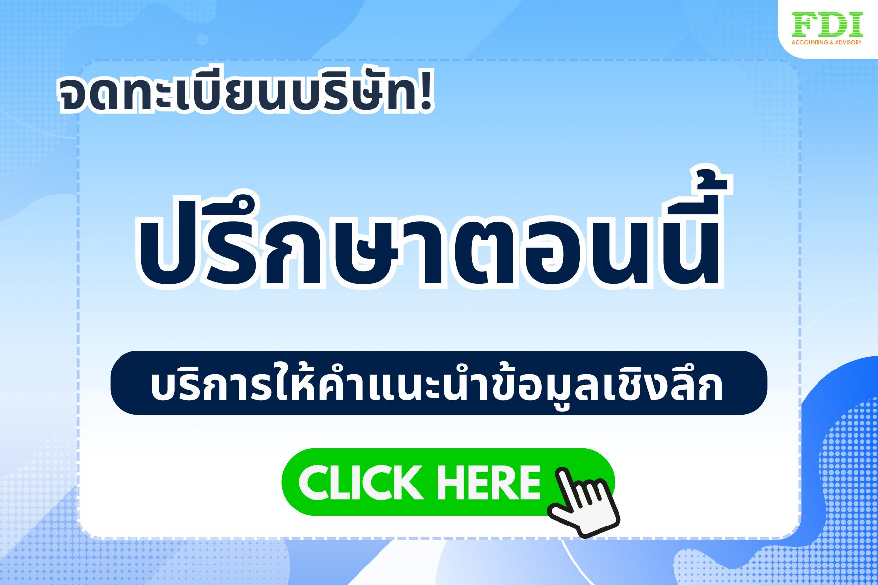 FDI ที่ปรึกษาบริการจดทะเบียนบริษัททุกรูปแบบ การขอใบอนุญาตดำเนินธุรกิจรวมถึงด้านวีซ่าและขอใบอนุญาตทำงานสำหรับชาวต่างชาติอย่างครบวงจร ไม่ว่าจะเป็นการเตรียมเอกสาร ยื่นคำร้อง เป็นตัวแทนจัดการเอกสารดำเนินการ พร้อมให้คำปรึกษา แนะนำเชิงลึกโดยผู้เชี่ยวชาญที่มีประสบการณ์ตรงเฉพาะด้าน ให้บริการสำหรับองค์กร บริษัท และคนต่างชาติที่ต้องการเข้ามาลงทุน ประกอบธุรกิจในไทย  ให้บริการโดยผู้เชี่ยวชาญ รองรับ 4 ภาษา ไม่ว่าจะเป็นภาษาไทย ภาษาอังกฤษ ภาษาญี่ปุ่น และภาษาจีน หากท่านใดต้องการขอรับคำปรึกษาสามารถเเจ้งเจ้าหน้าที่เพื่อขอรับคำปรึกษาได้