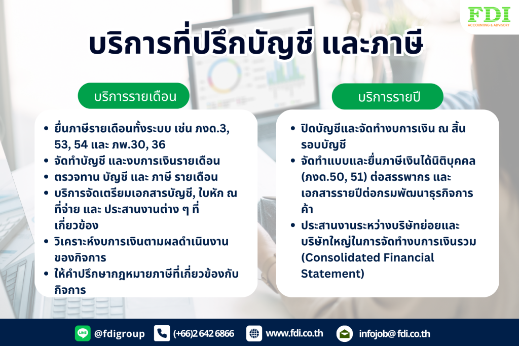 FDI ที่ปรึกษาบัญชีและภาษี สำหรับนิติบุคคลโดยเฉพาะ เราพร้อม会計コンサルティングおよび税務計画サービスを通じて、貴社の持続可能な未来への発展を全力でサポートいたします。豊富な経験と深い知識を持つ専門家チームが、持続可能なビジネスの目標達成に向けてお手伝いいたします。